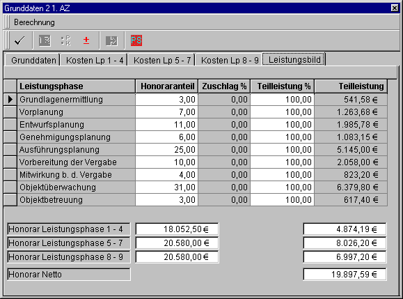 Hier wird das Leistungsbild dem Baufortschritt angepasst. Das Nettohonorar ist sofort ersichtlich.