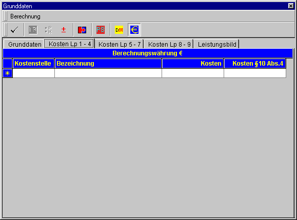 | Anrechenbare KostenDie Anrechenbaren Kosten werden übersichtlich in Tabellenform erfaßt.  Da in diese Tabellenform beliebig viele Zeilen eingefügt werden können,