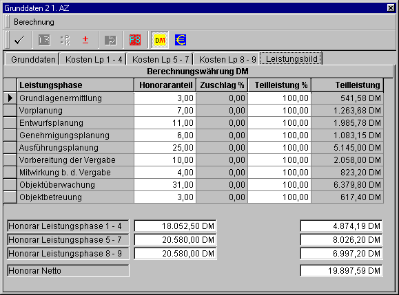 Hier wird das Leistungsbild dem Baufortschritt angepaßt. Das Nettohonorar ist sofort ersichtlich.